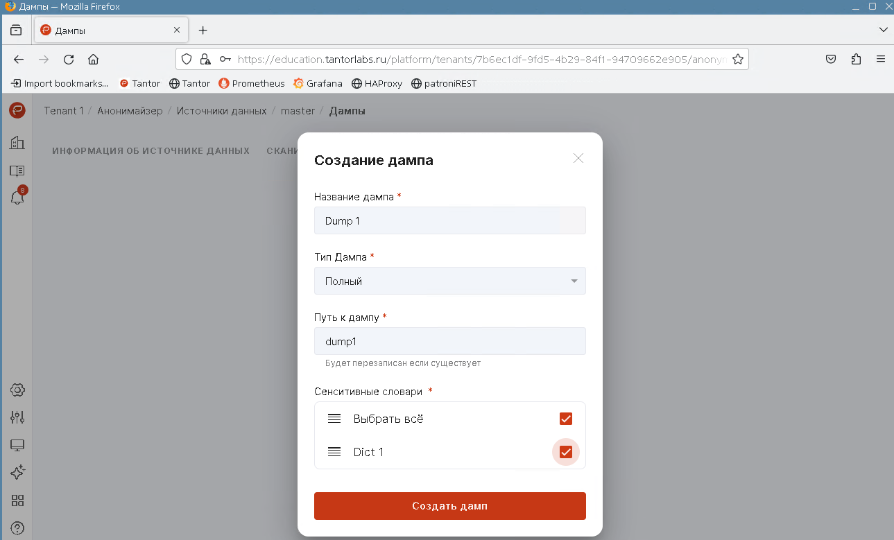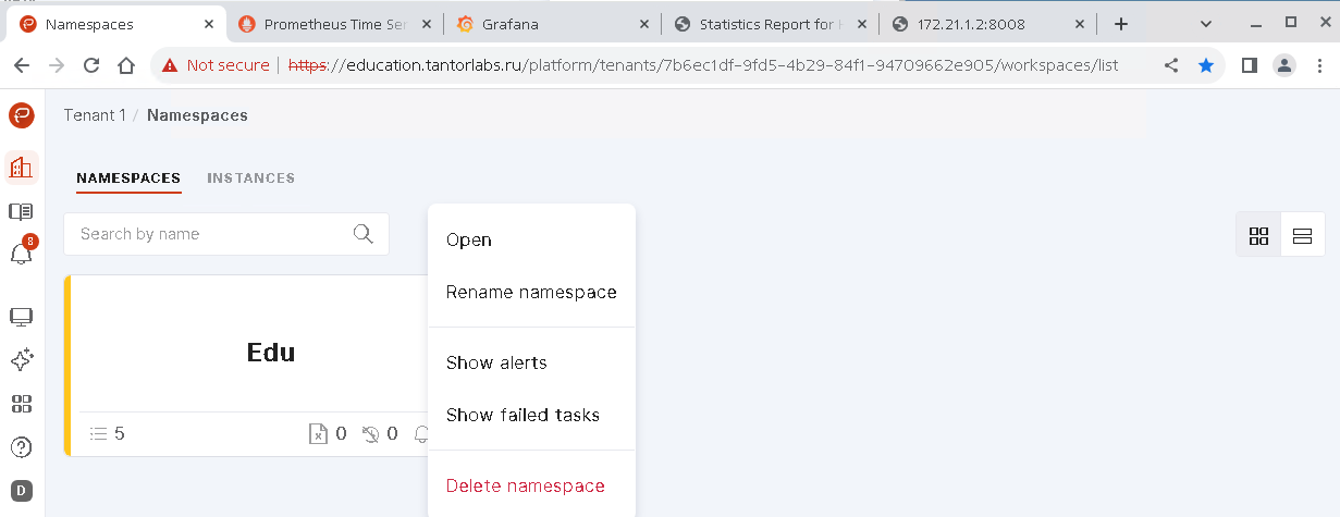 8) Перейдите в Tenant 1. Для этого нажмите в левом верхнему углу на красный кружок с логотипом Тантор и откроется список тенантов.