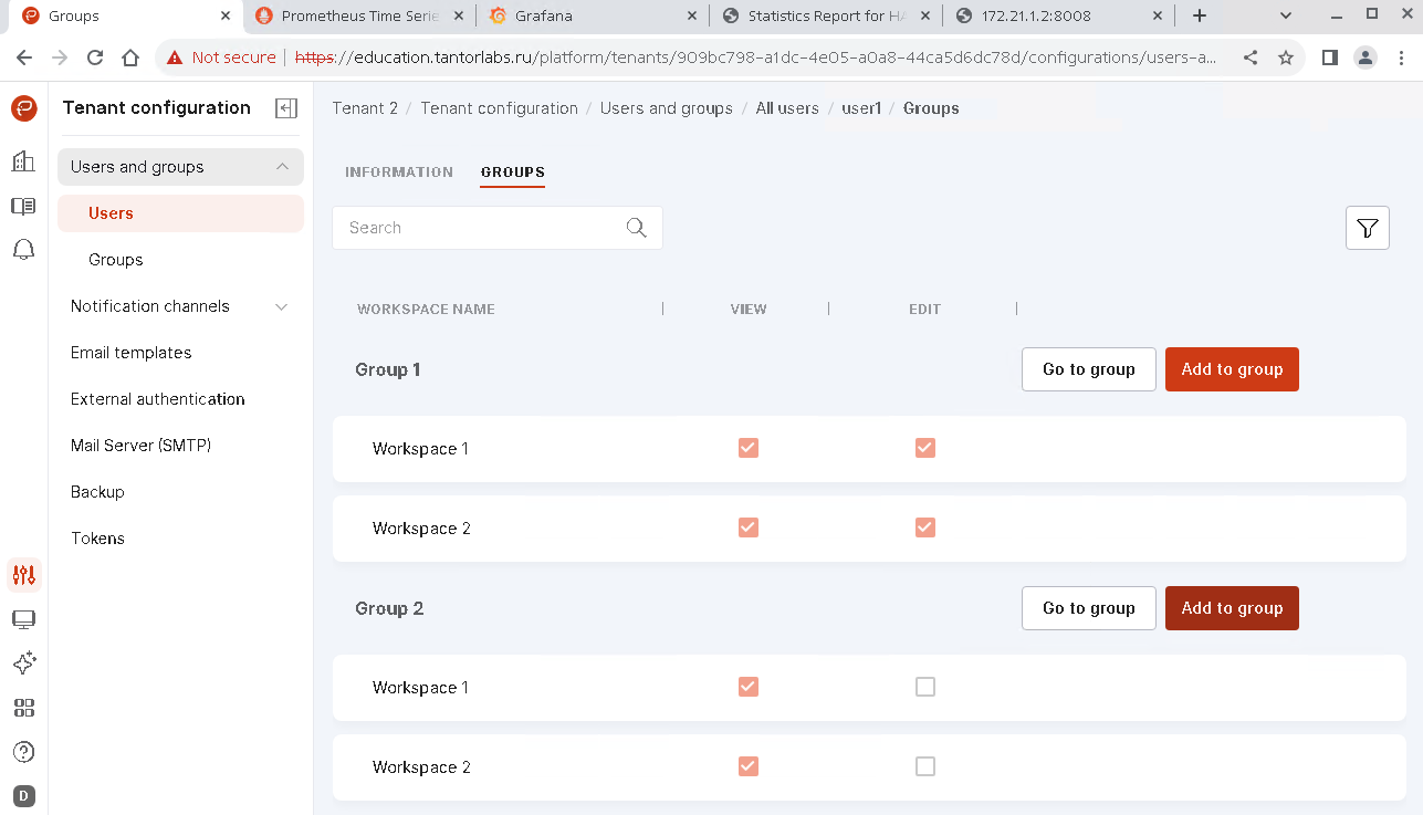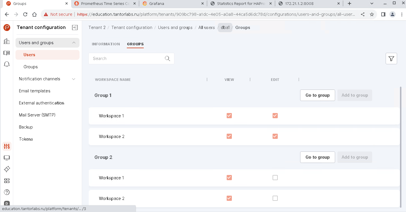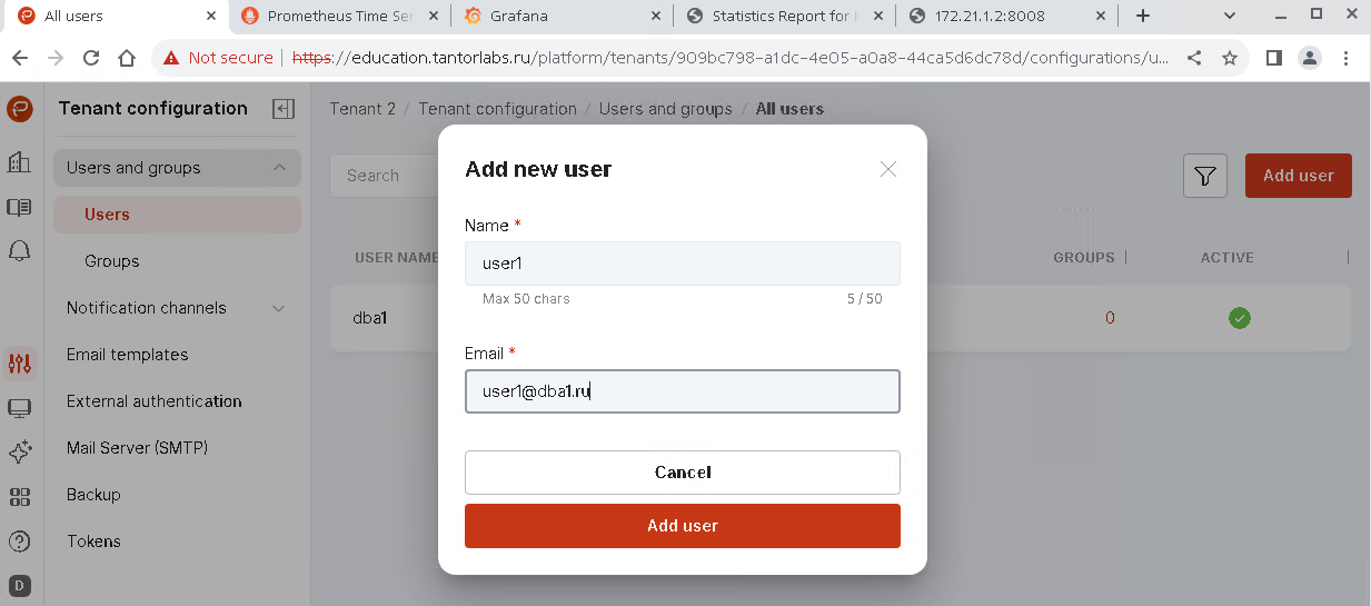 Нажмите на значок Настройки тенанта на левой полосе меню. Откроется меню Настройки тенанта. В меню Пользователи найдите двух пользователей dba1@dba1.ru и user1@dba1.ru