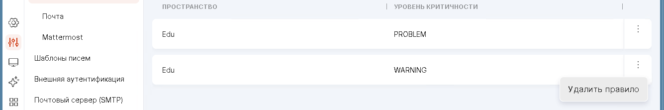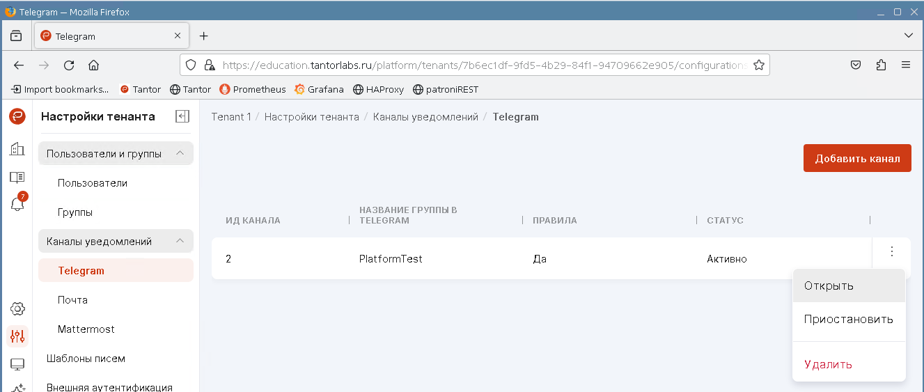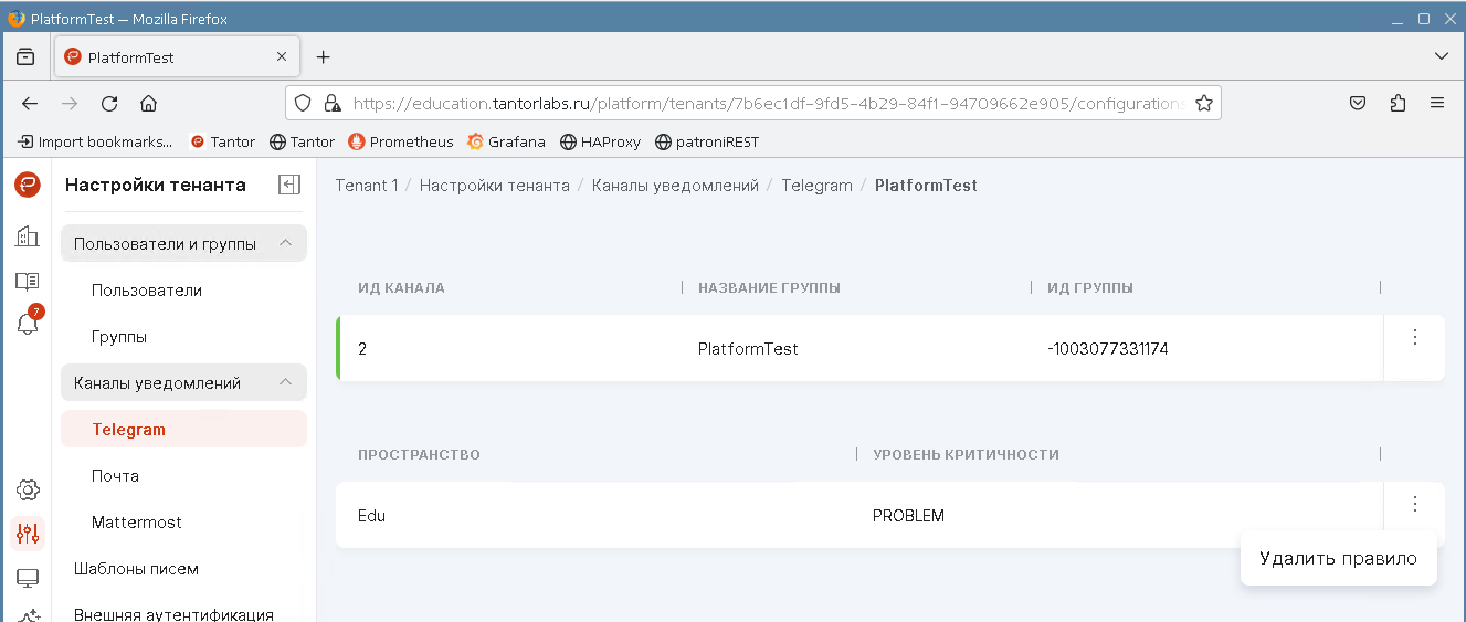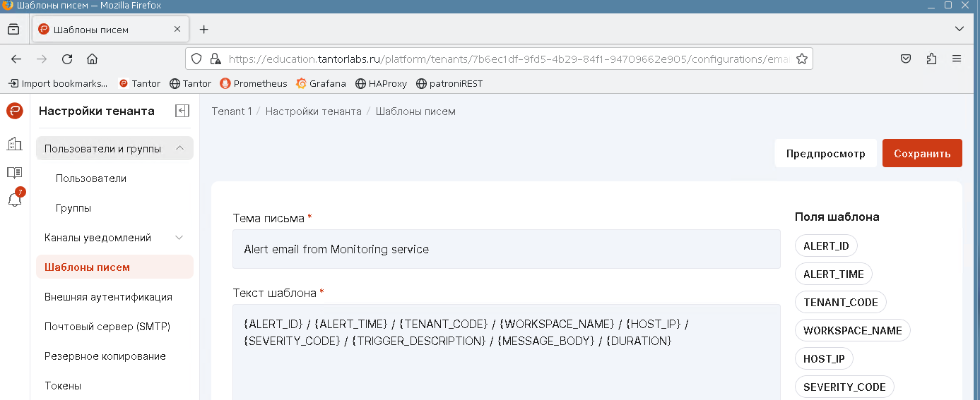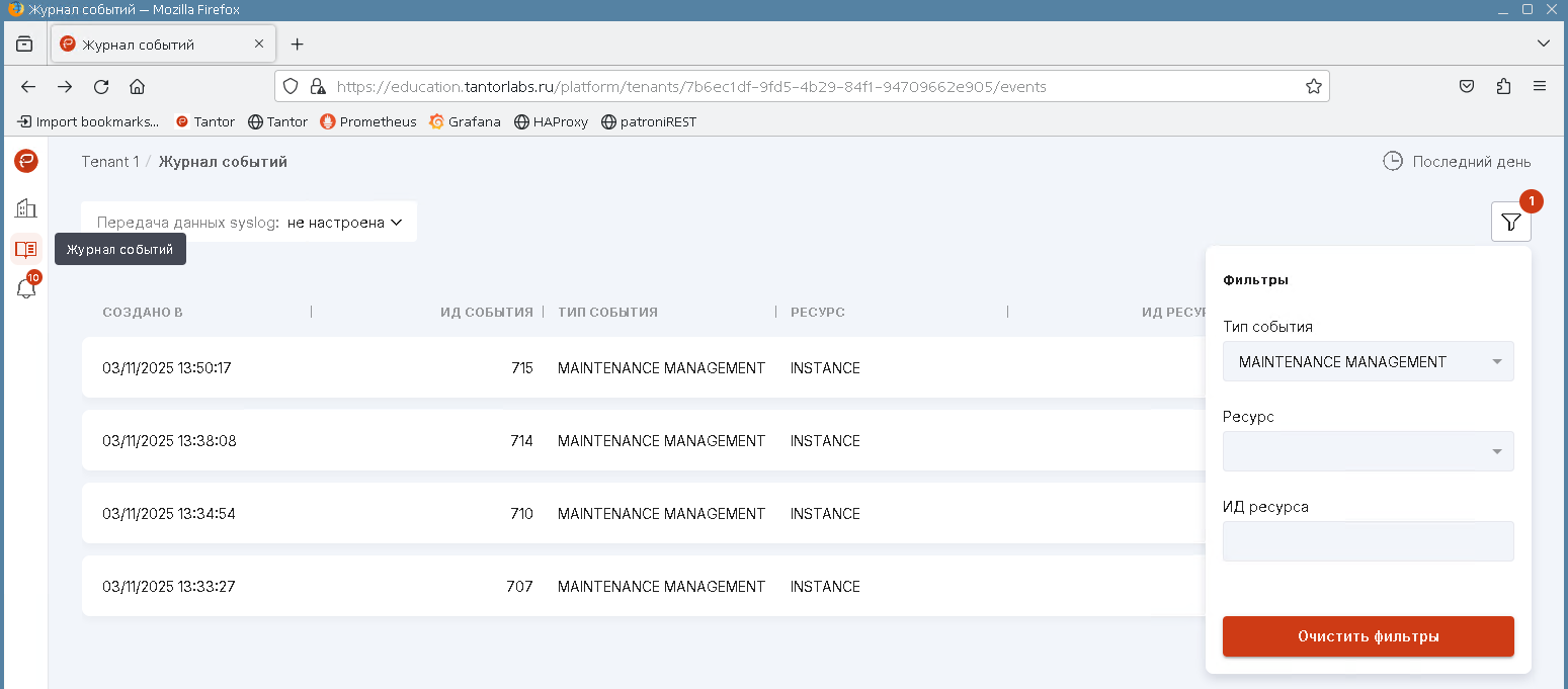 Тенант, Журнал событий, Оповещения, Настройки тенанта.