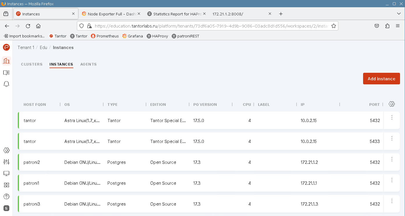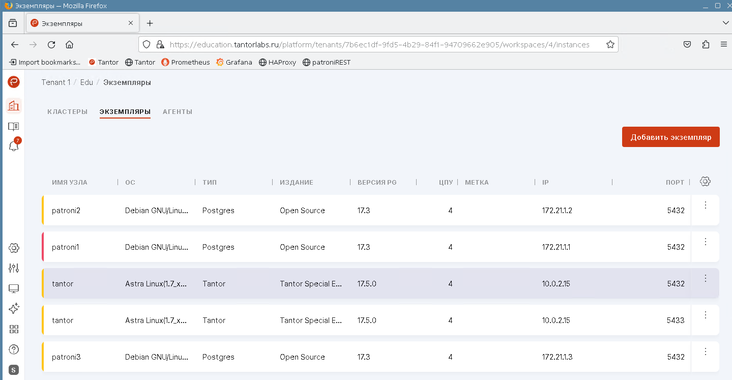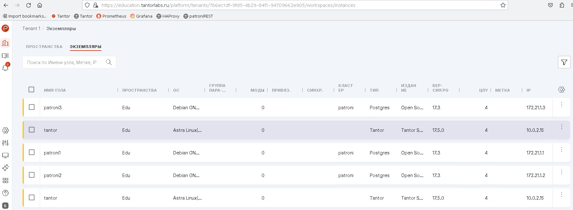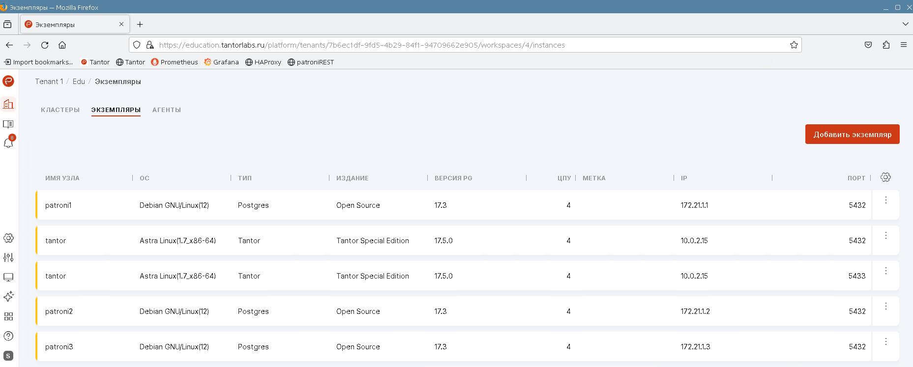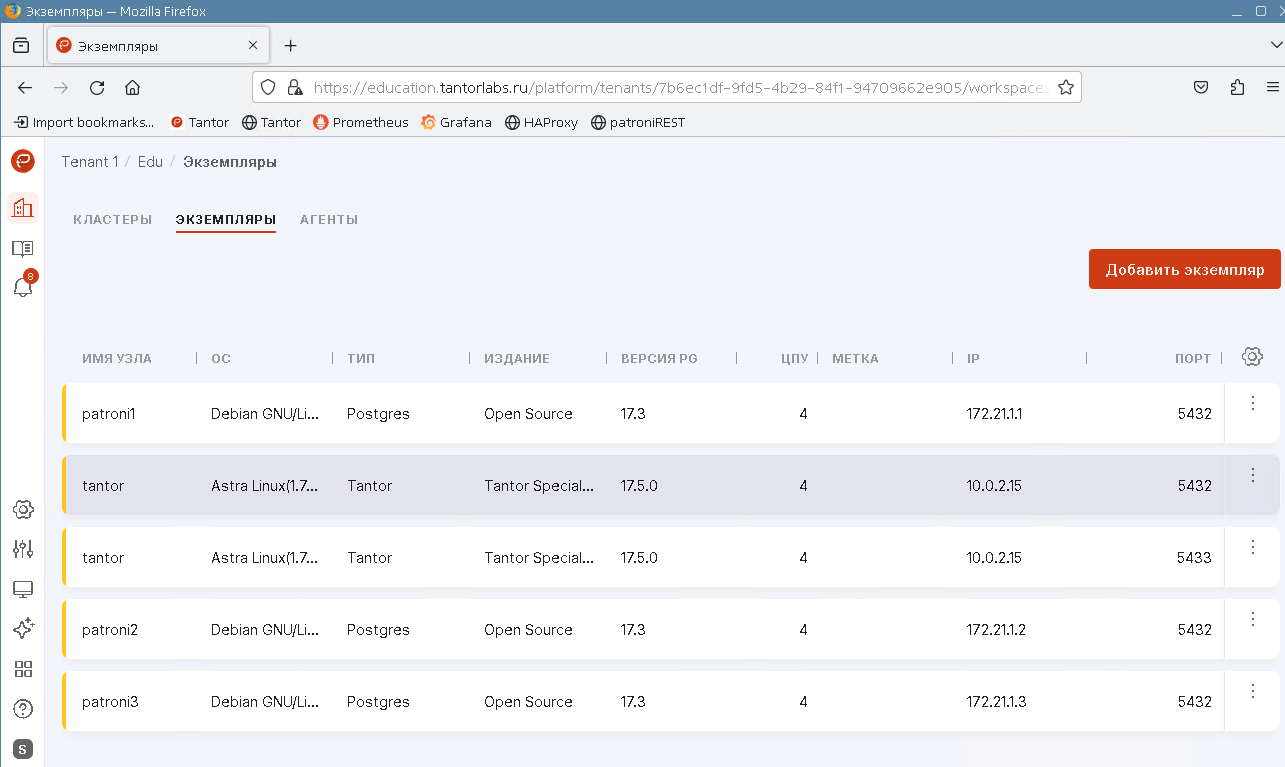 В Tenant 1 имеется два экземпляра Tantor Postgres и три экземпляра PostgeSQL.