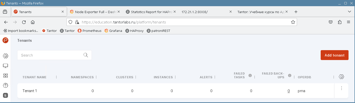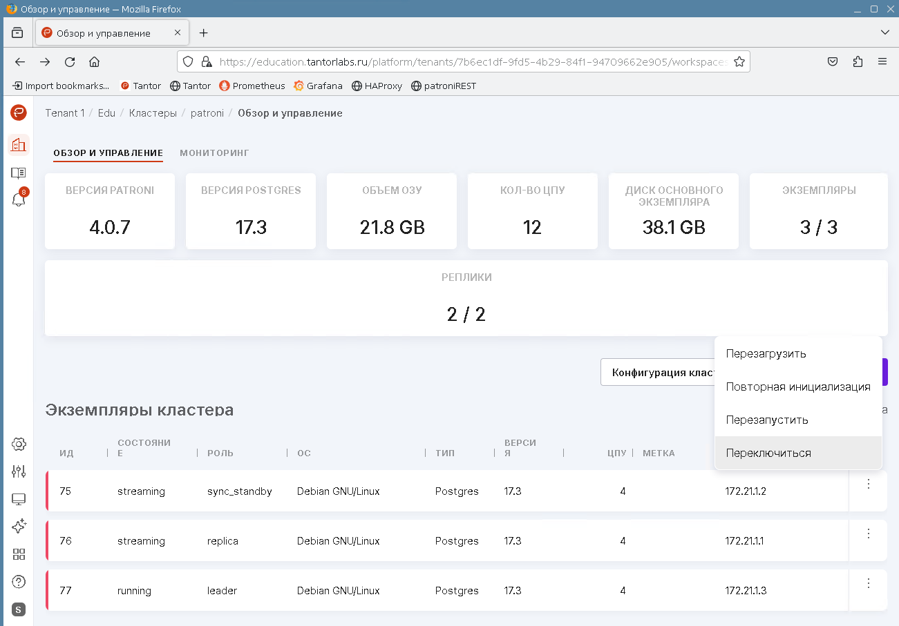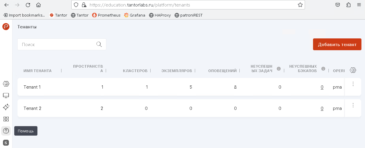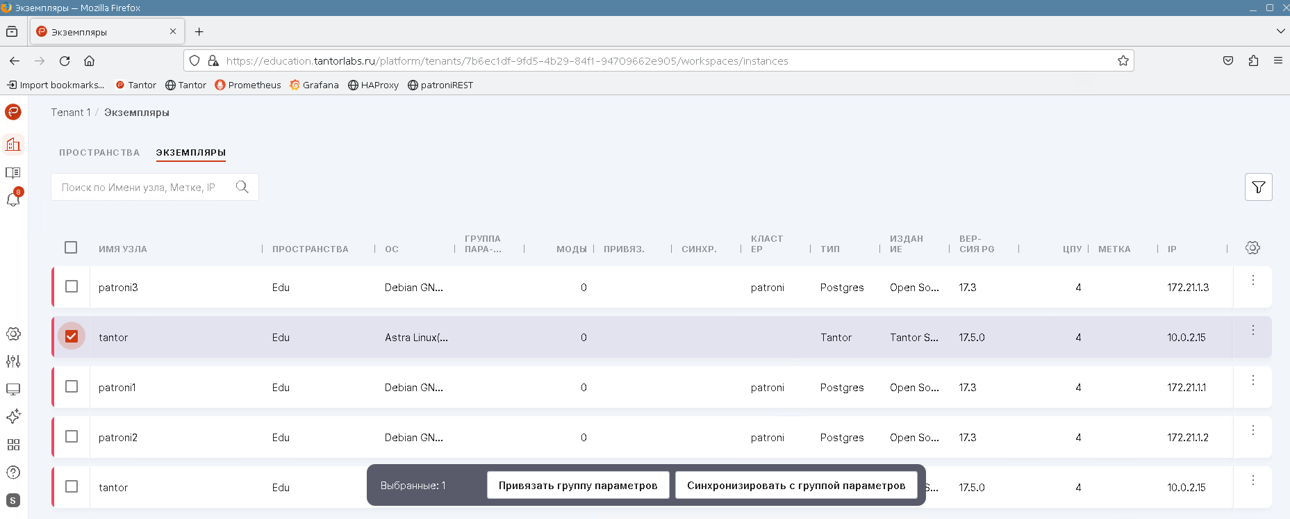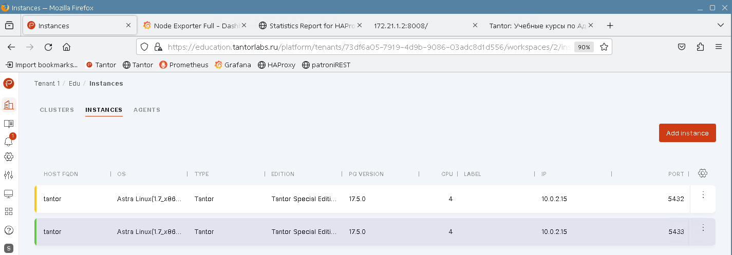 В Tenant 1 имеется два экземпляра Tantor Postgres и три экземпляра PostgeSQL.