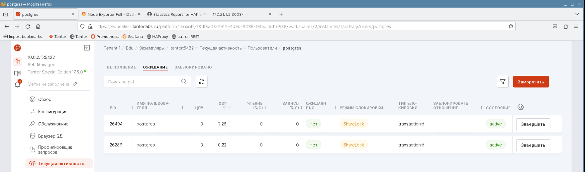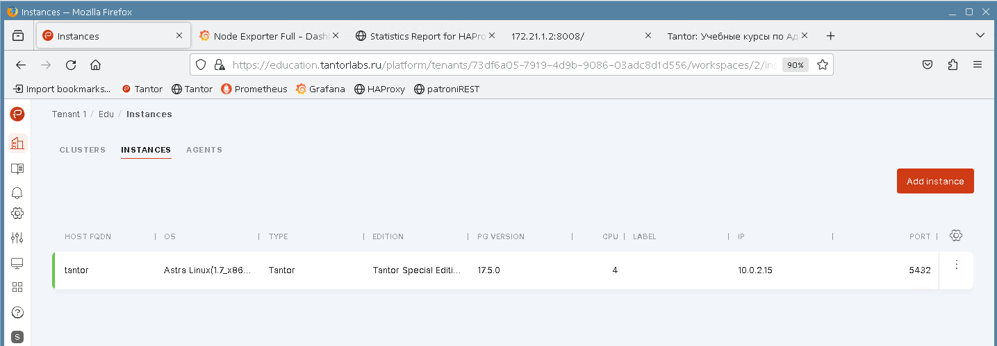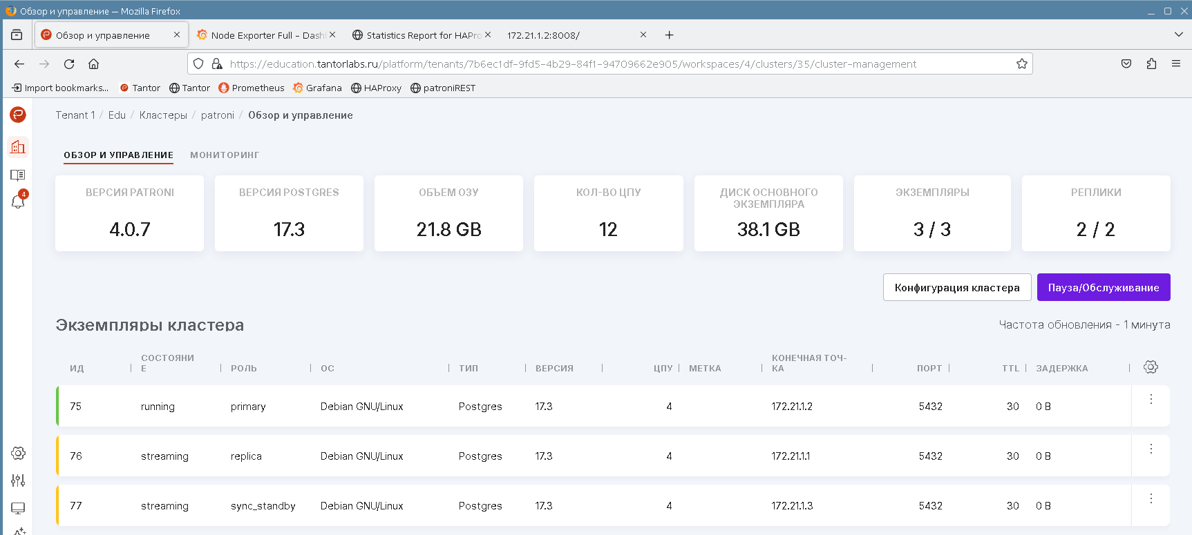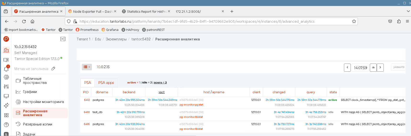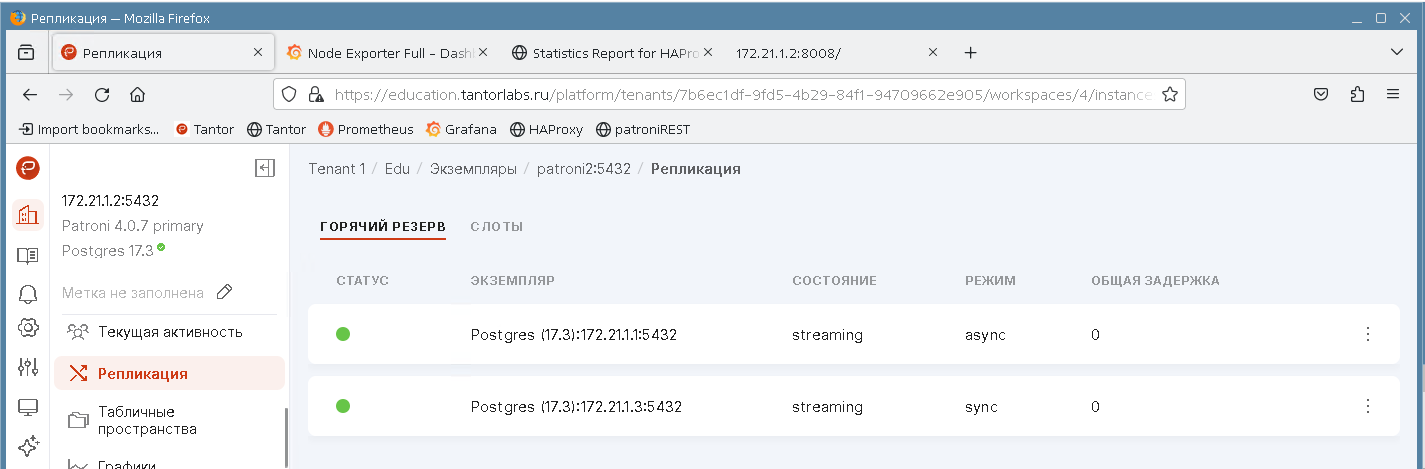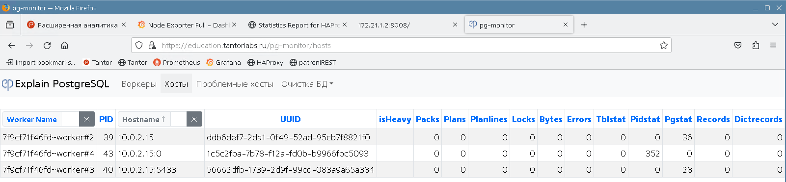 Для проверки того, что рабочие процессы подсоединяются, можно открыть страницу в браузере: https://education.tantorlabs.ru/pg-monitor/hosts