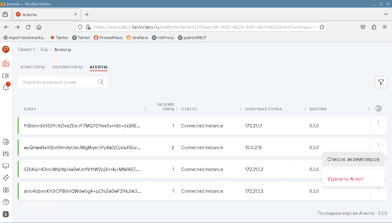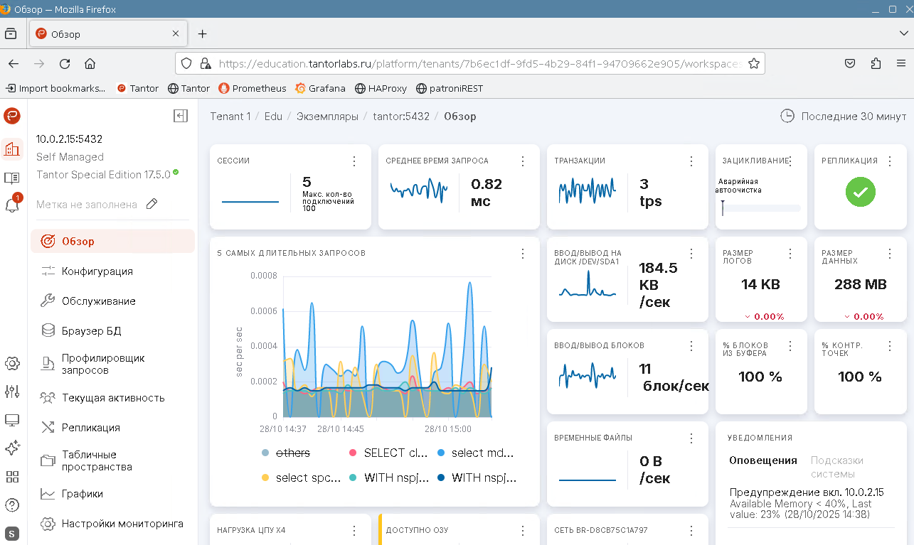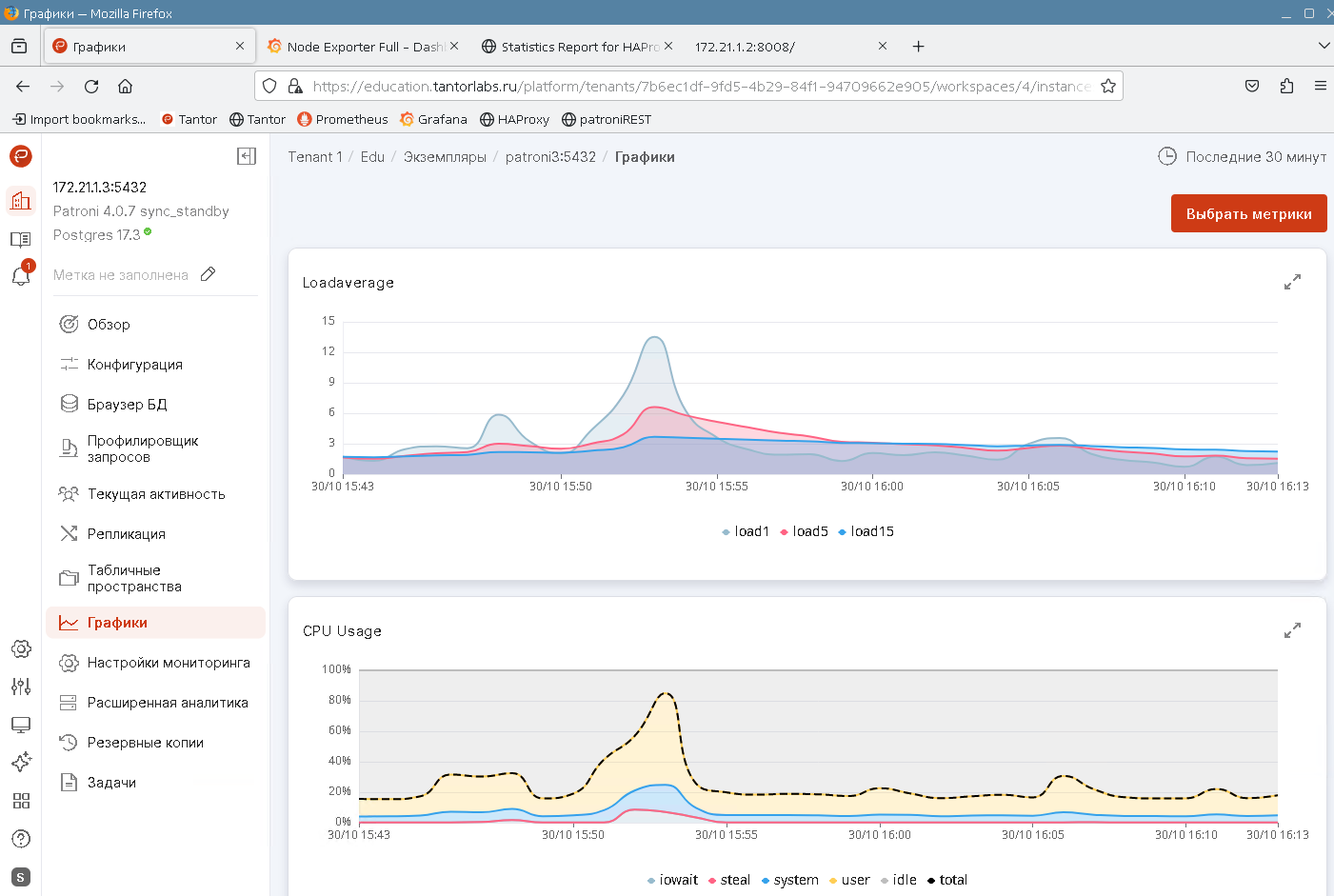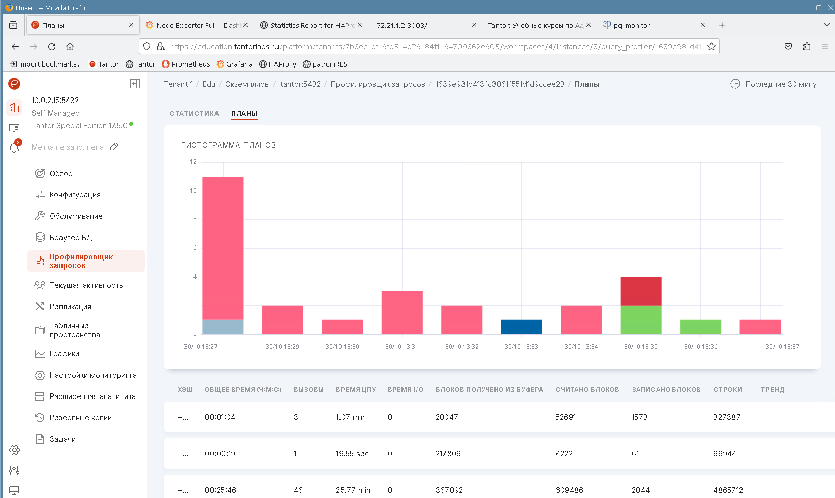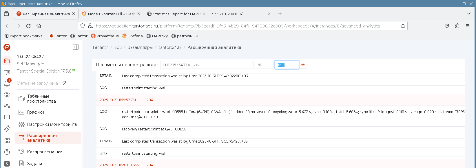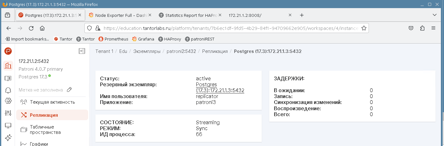Для проверки того, что рабочие процессы подсоединяются, можно открыть страницу в браузере: https://education.tantorlabs.ru/pg-monitor/hosts