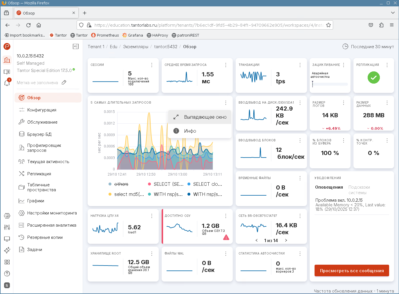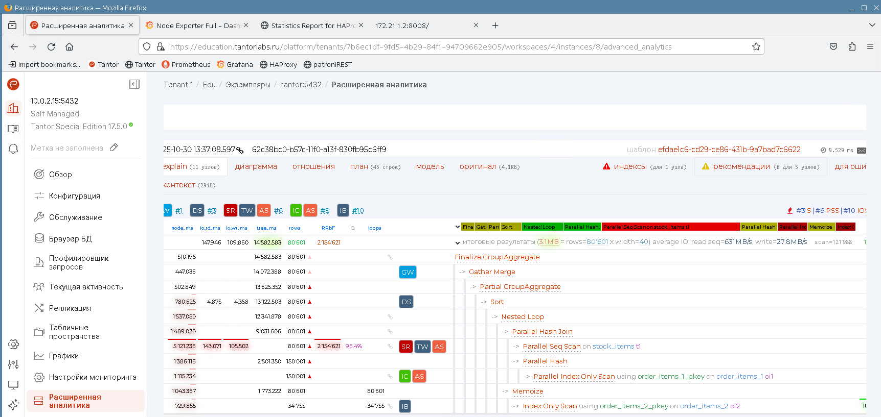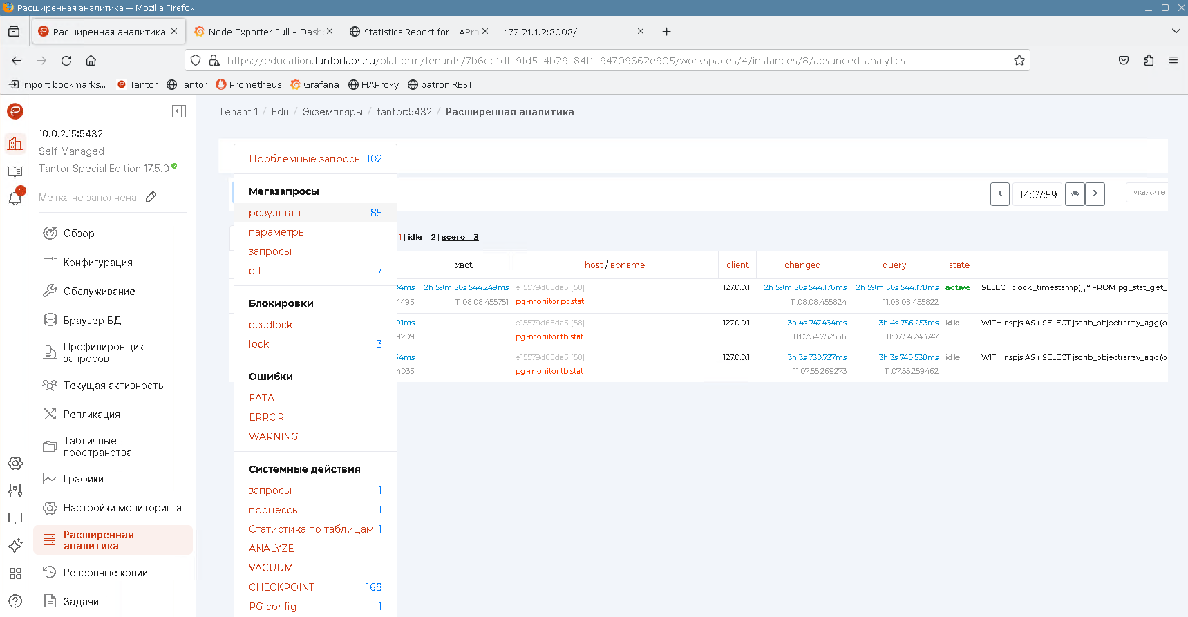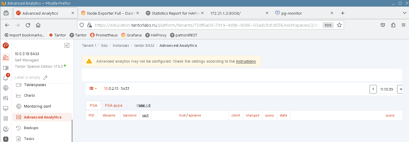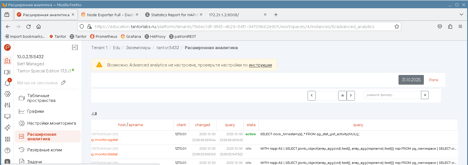 4) Откройте страницу Расширенной аналитики. Для этого в браузере откройте Tenant 1 -> Edu -> 10.0.2.15:5432 -> Advanced Analytics