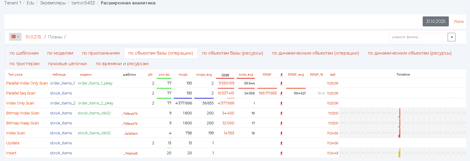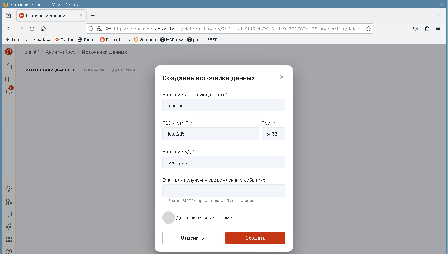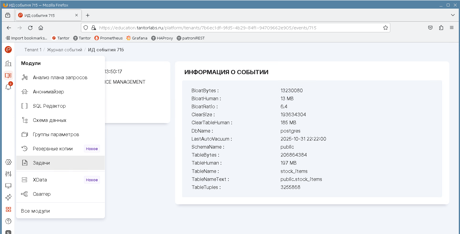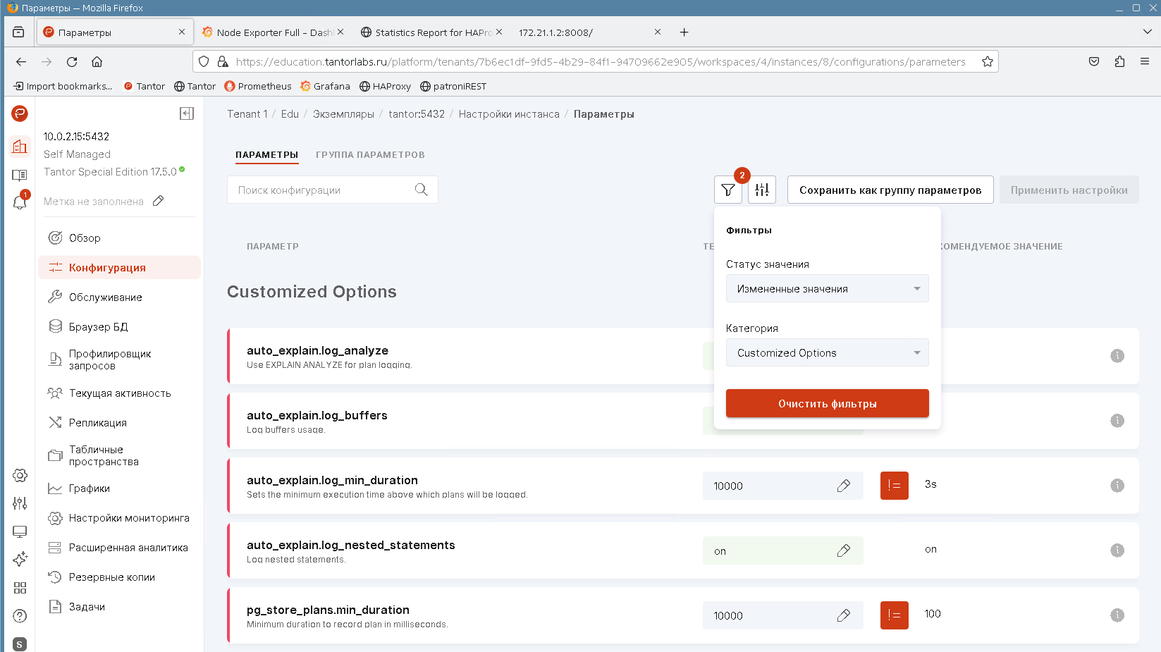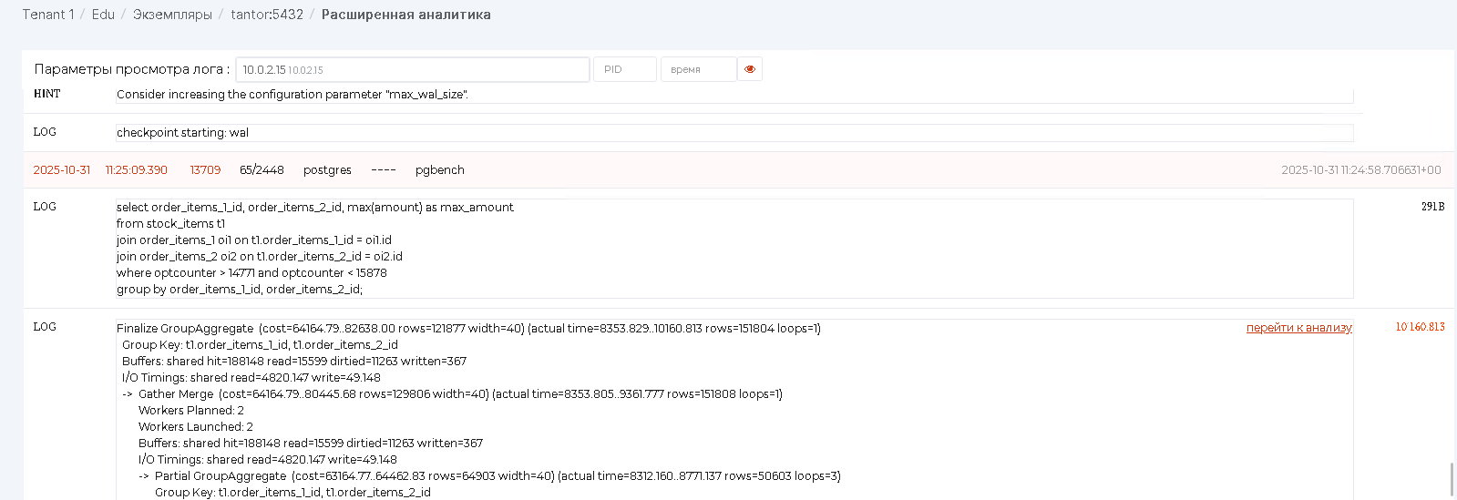 4) Откройте страницу Расширенной аналитики. Для этого в браузере откройте Tenant 1 -> Edu -> 10.0.2.15:5432 -> Advanced Analytics