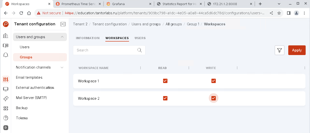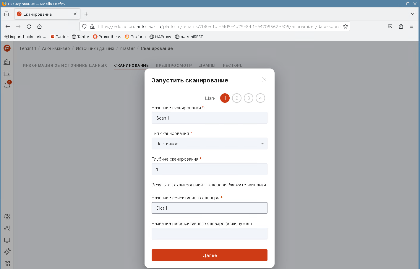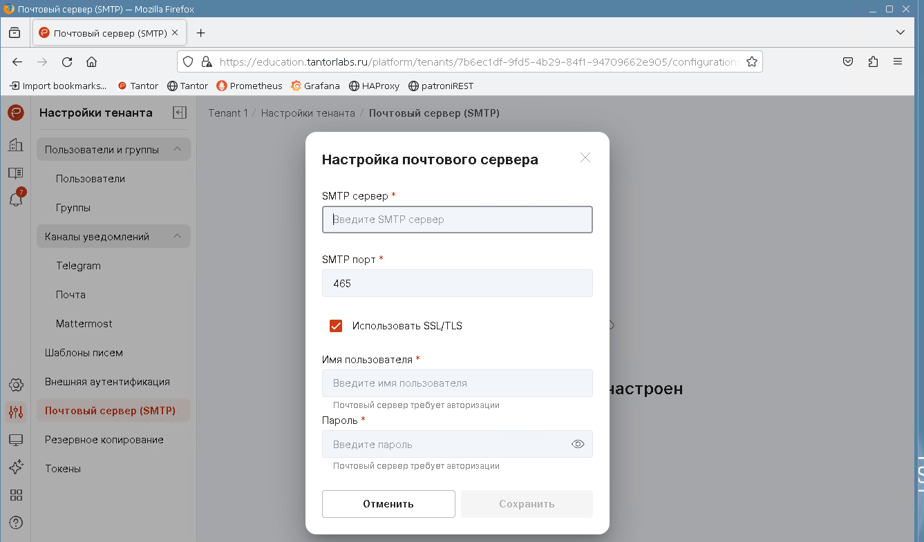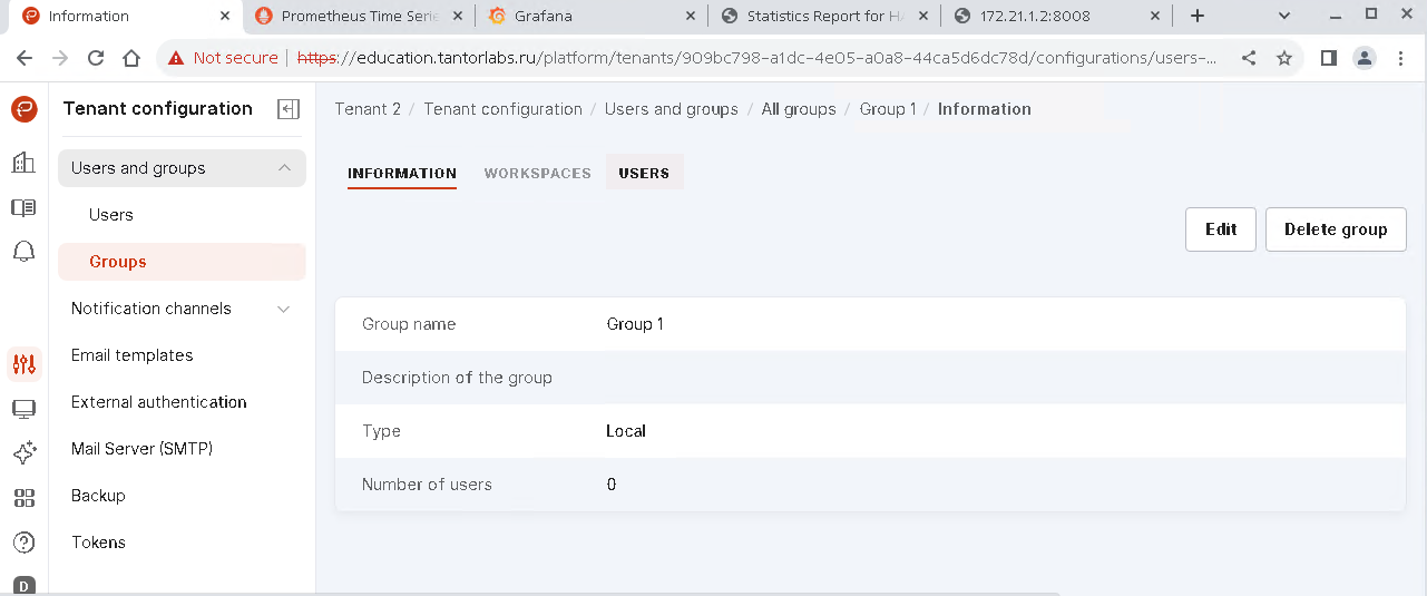 1) Кликните в окне браузера слева вверху на круглый оранжевый значок с логотипом Тантор. Откроется страница со списком тенантов. Кликните на строку Tenant 1. Откроется страница со списком пространств. Вы находитесь в тенантеTenant 1 и на левой вертикальной полосе меню появится значок Tenant configuration (на картинке ниже шестой по счёту, подсвечен красноватым фоном). Кликните на это значок и появится меню Tenant configuration.