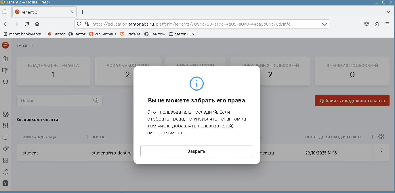 появится страница с описанием тенанта, на которой и будет список владельцев тенанта. Владельцы системы также присутствуют в этом списке: