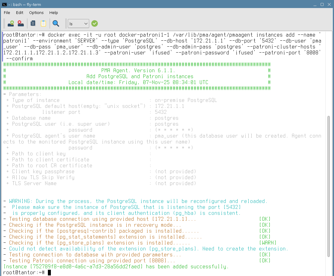 docker exec -it -u root docker-patroni1-1 /var/lib/pma/agent/pmaagent instances add --name 'patroni1' --environment 'SERVER' --type 'PostgreSQL' --db-host '172.21.1.1' --db-port '5432' --db-user 'pma_user' --db-pass 'pma_user' --db-admin-user 'postgres' --db-admin-pass 'postgres' --patroni-cluster-hosts '172.21.1.1' --patroni-user 'ifused' --patroni-password 'ifused' --patroni-port '8008' --confirm