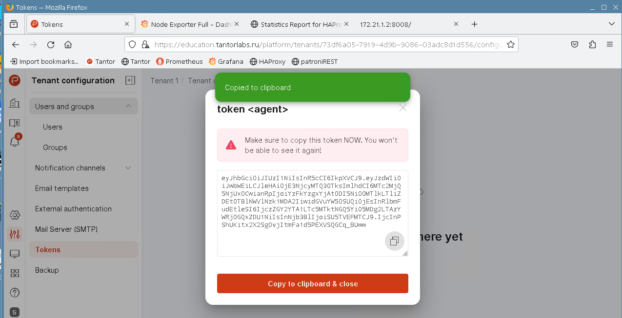 Нажмите на кнопку Скопировать в буфер обмена и закрыть. Токен ещё раз будет скопирован в буфер обмена, окно с токеном закроется, токен появится в списке.