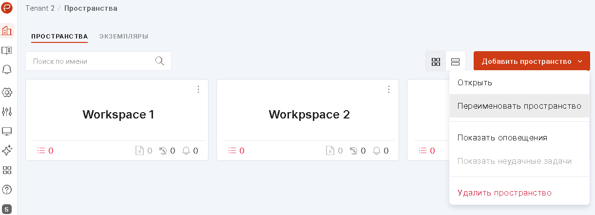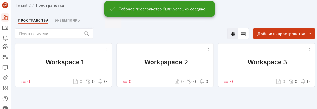 7) Рабочие пространства относятся к тенантам. Имя тенанта Tenant 2 отображается на странице сверху слева. По умолчанию, Пространства отображаются в виде плашек. Нажав на значок слева от красной кнопки Добавить пространство, список можно отобразить в виде таблицы.