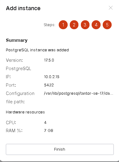 7) В окне браузера на 4 шаге кликните на кнопку Add. Появится шаг 5 с подтверждением, что экземпляр был добавлен. Кликните на кнопку Finish.
