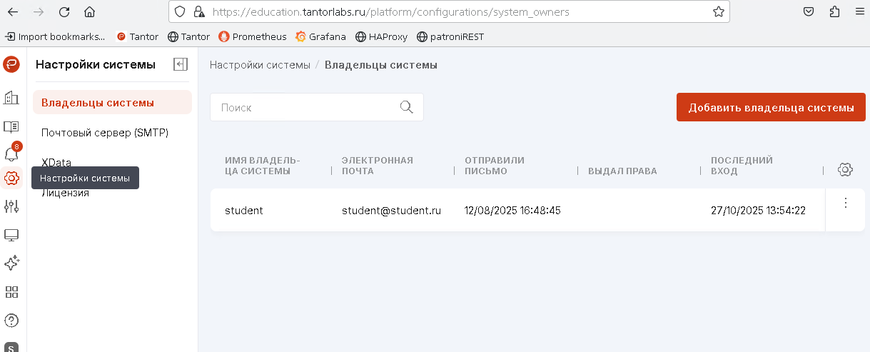 10) На левой полосе меню найдите пункт меню Настройки системы и откройте его. Вы увидите список владельцев системы: