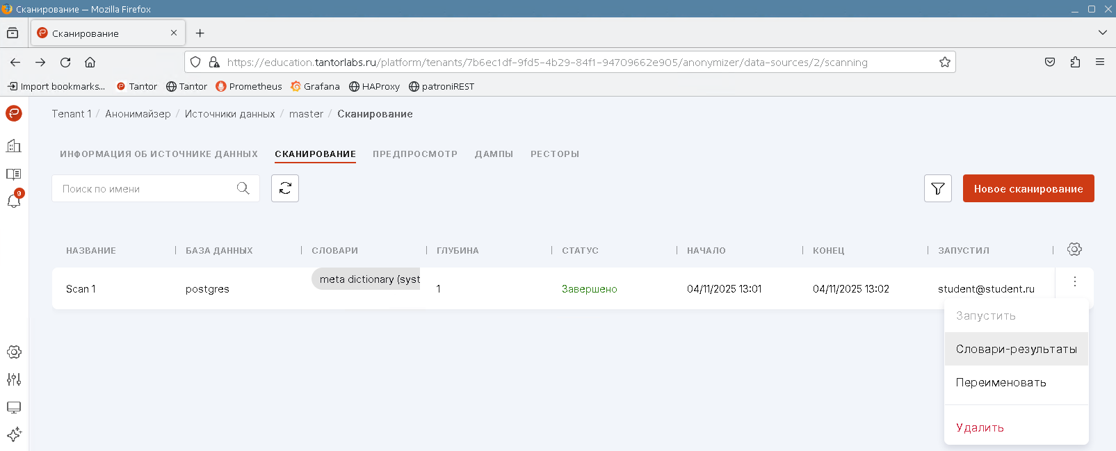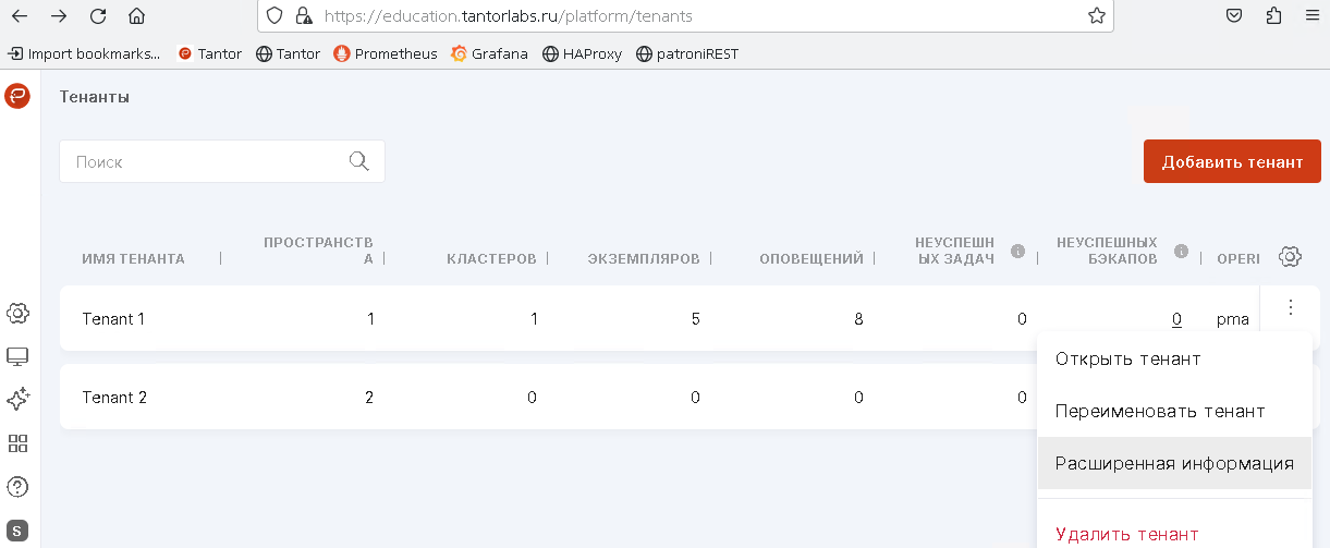 11) Чтобы увидеть их список, нужно перейти в список тенантов (кликнуть на оранжевый кружок с логотипом Тантор в левом верхнем углу страницы), справа на строке Tenant 1 кликнуть на три точки, появится выпадающее меню. В меню выбрать пункт Расширенная информация: