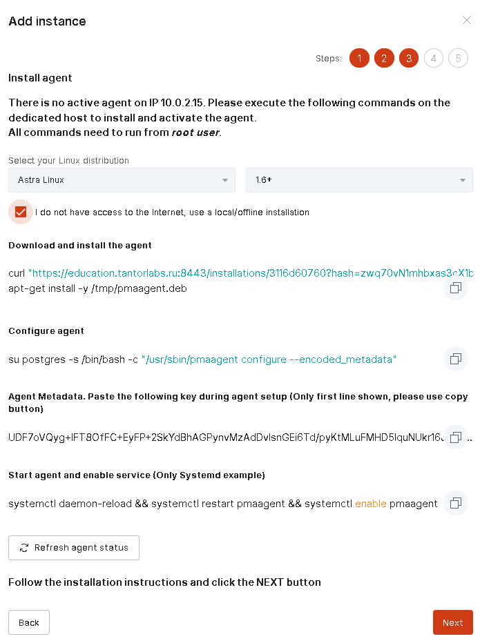 3) На 3 шаге добавления Агента выберите операционную систему Astra Linux, версию 1.6+, поставьте галочку I do not have access to th Internet, use local/offline installation: