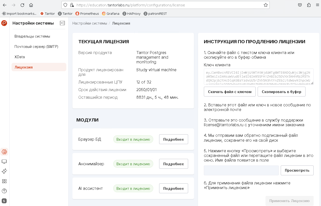 В столбце ЦПУ=4 у всех экземпляров. Это значит, что экземпляры могут использовать 4 ядра процессора. Экземпляры ТИП=Tantor не исчерпывают лицензии Платформы. Другие форки исчерпывают Лицензированные ЦПУ, то есть в лицензированных ЦПУ учитываются ядра ТИП=Postgres, а это три экземпляра PostgreSQL: 3*4=12.