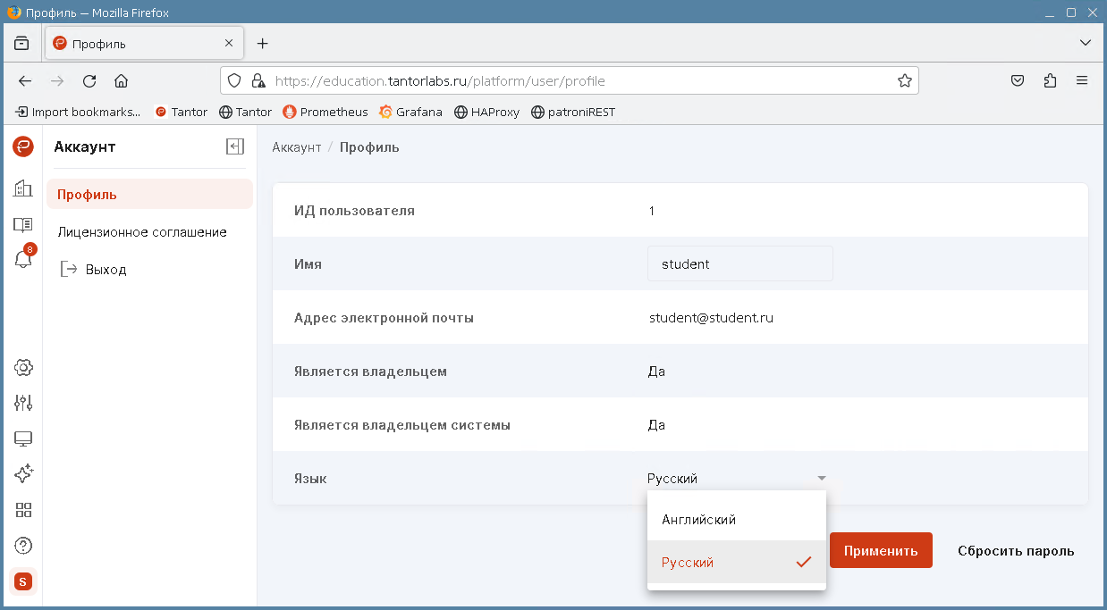 5) На странице Профиля пользователя поменяйте язык на Английский, нажмите кнопку Применить. Потом поменяйте язык на Russian, нажмите Apply: