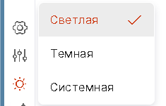 6) В левой полосе меню найдите значок Смена темы, поменяйте тему на Тёмную, Светлую, Системную. Иконки значка при этом будут меняться. Оставьте Системную тему.