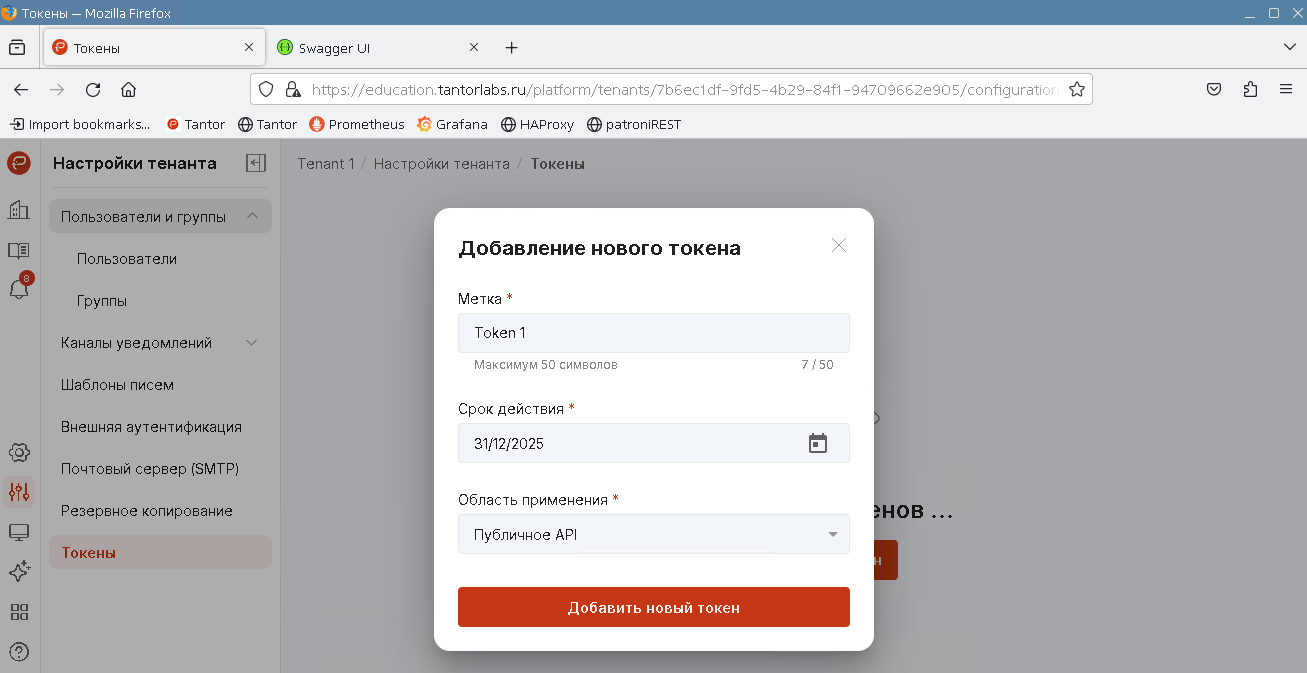 В конце меню будет строка Tokens, кликните на эту строку. На открывшейся странице кликните на красную кнопку Add new token. В появившемся окне выберите Scope = Install, Token label = agent, Expiration = завтрашнюю дату. Кнопка Add new token станет активной (красного цвета), нажмите на эту кнопку.