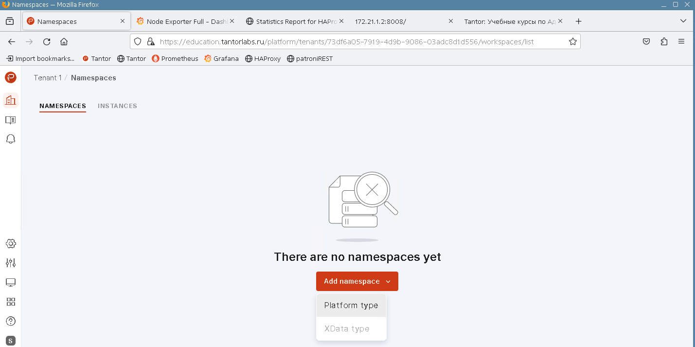 8) Кликните на Tenant 1. Откроется страница с пространствами. Пространств нет. Кликните на кнопку Add namespace и выберите в появившемся меню тип пространства: Platform type.