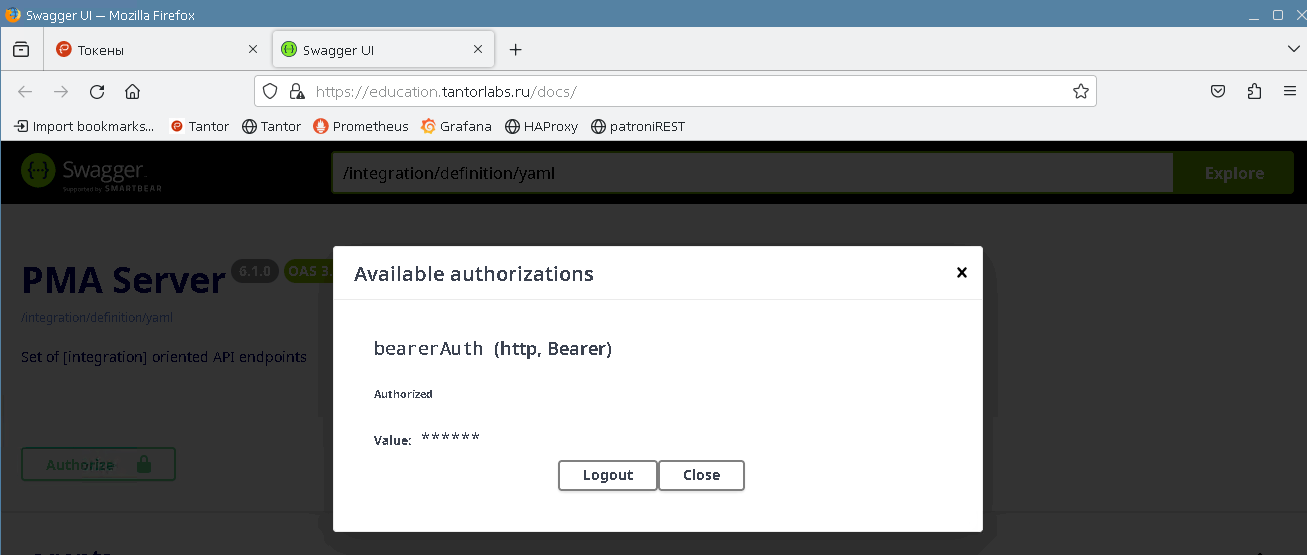 5) Вставьте скопированное значение токена, нажмите зелёную кнопку Authorize.