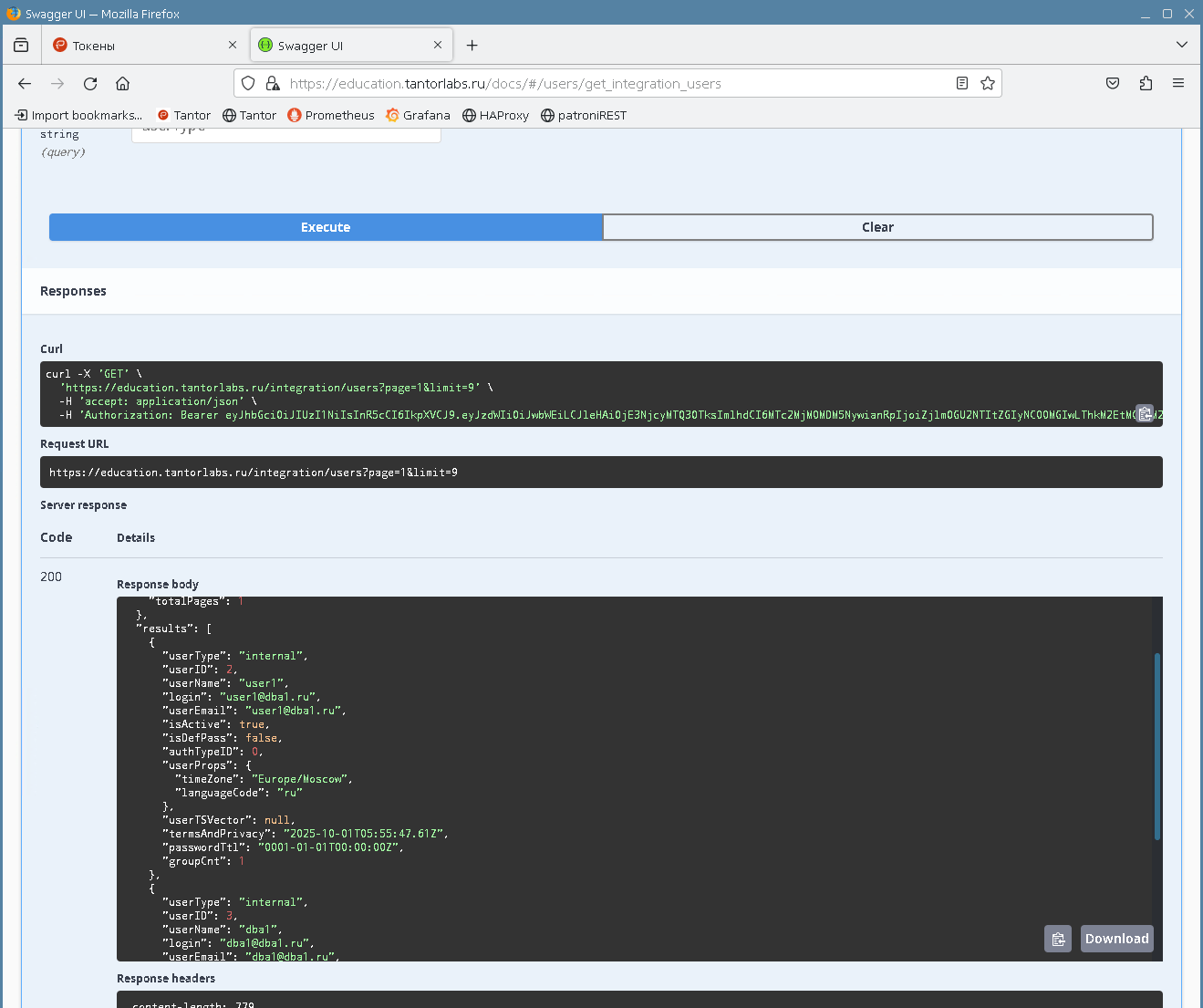 {"pager":{"currentPageId":1,"currentPageRecordsNumber":2,"totalRecords":2,"recordsPerPage":9,"totalPages":1},"results":[{"userType":"internal","userID":2,"userName":"user1","login":"user1@dba1.ru","userEmail":"user1@dba1.ru","isActive":true,"isDefPass":false,"authTypeID":0,"userProps":{"timeZone":"Europe/Moscow","languageCode":"ru"},"userTSVector":null,"termsAndPrivacy":"2025-10-01T05:55:47.61Z","passwordTtl":"0001-01-01T00:00:00Z","groupCnt":1},{"userType":"internal","userID":3,"userName":"dba1","login":"dba1@dba1.ru","userEmail":"dba1@dba1.ru","isActive":true,"isDefPass":false,"authTypeID":0,"userProps":{"timeZone":"Europe/Moscow","languageCode":"en"},"userTSVector":null,"termsAndPrivacy":"2025-10-01T06:19:54.559Z","passwordTtl":"0001-01-01T00:00:00Z","groupCnt":1}]}