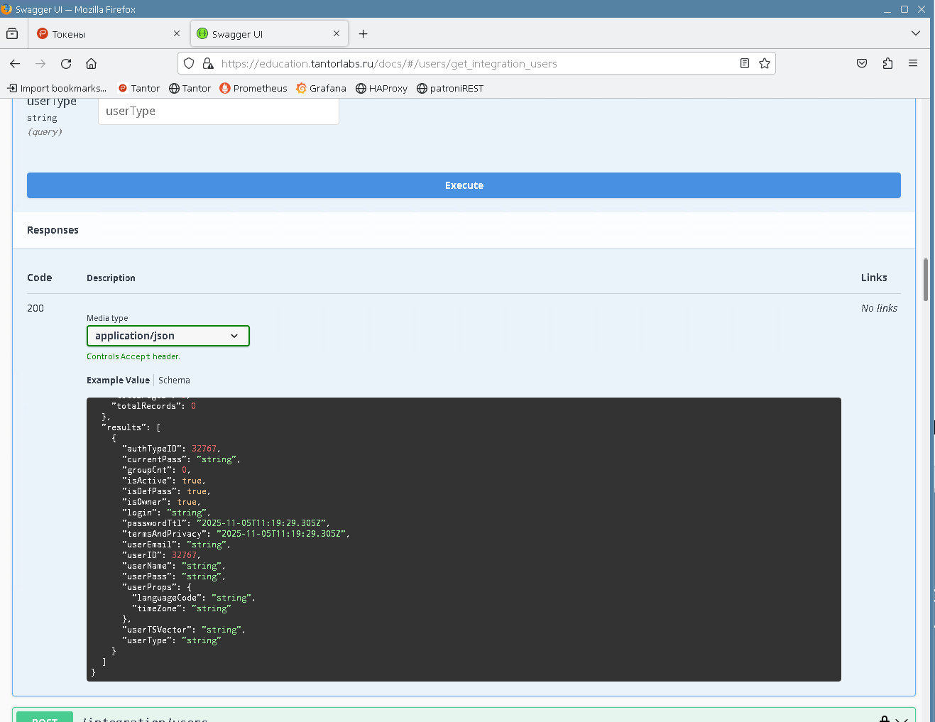 9) Промотайте полосой прокрутки до длинной синей кнопки Execute и кликните на эту кнопку. Страница отправит запрос на хост Платформы и вернёт результат. который появится на странице. В результате будет список пользователей тенанта, токен которого использовался при авторизации. Также на странице будет запрос для утилиты командной строки curl. Полосой прокрутки справа в чёрном фрейме можно посмотреть всё содержимое ответа сервера Платформы. В ответе формата JSON будет два пользователя user1@dba1.ru и dba1@dba1.ru