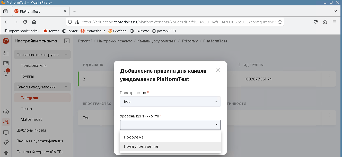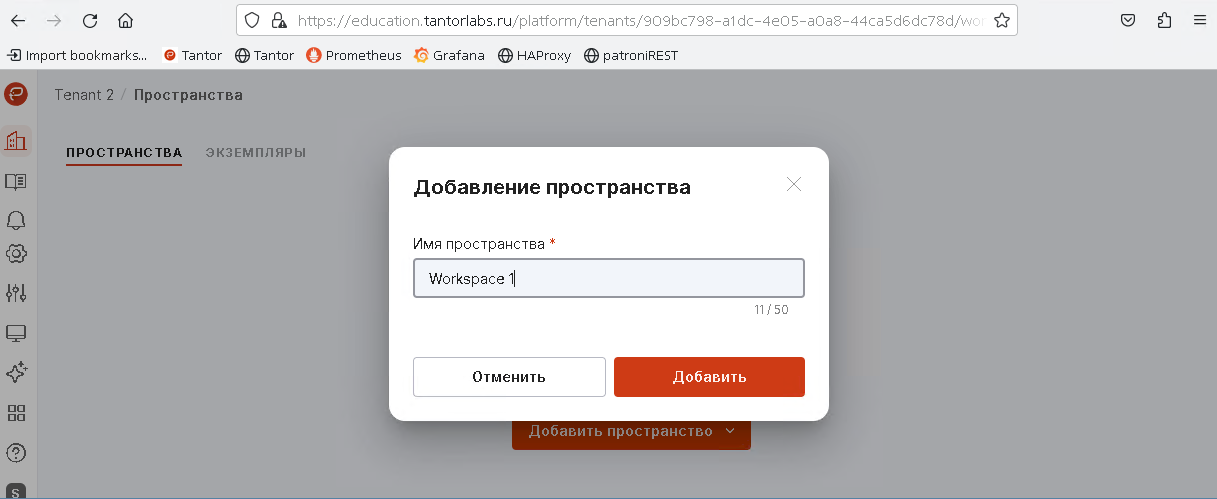 2) Перейдите на страницу созданного тенанта. В нём не будет Пространств. Добавьте новое пространство Тип = Платформа и назовите его Workspace 1:
