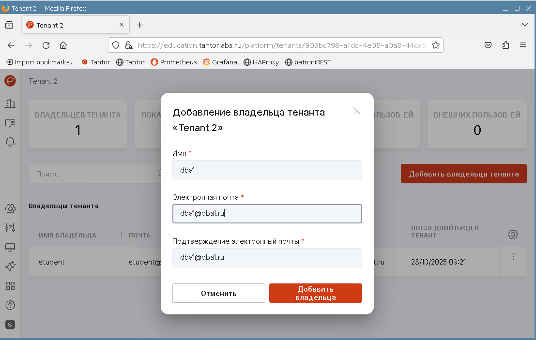 Для этого кликните на оранжевый кружок с логотипом Тантор в левом верхнем углу страницы, справа на строке Tenant 2 кликните на три точки, появится выпадающее меню. В меню выберите пункт Расширенная информация. На этой странице нажмите кнопку Добавить владельца тенанта.