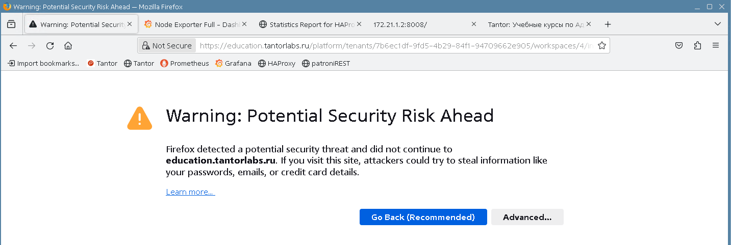 1) Запустите браузер Chromium. При открытии страницы https://education.tantorlabs.ru выдастся предупреждение Your connection is not private. Нажмите в окне браузера кнопку Advanced, затем ссылку Proceed to education.tantorlabs.ru (unsafe) и появится страница входа в Платформу. В окне браузера Chromium удобно тестировать сессии пользователей Платформы.