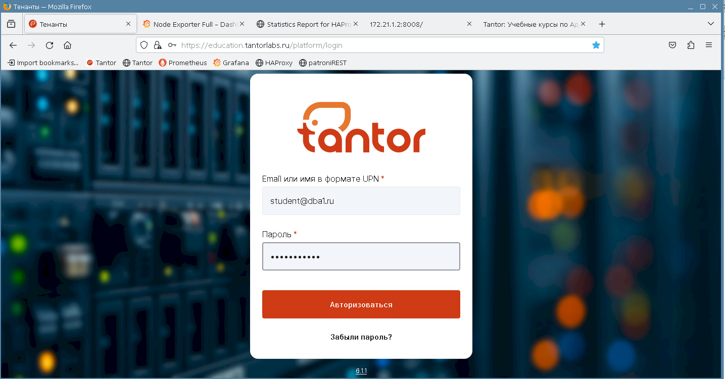 6) Введите имя и пароль: student@dba1.ru/Student123! и нажмите кнопку Авторизоваться