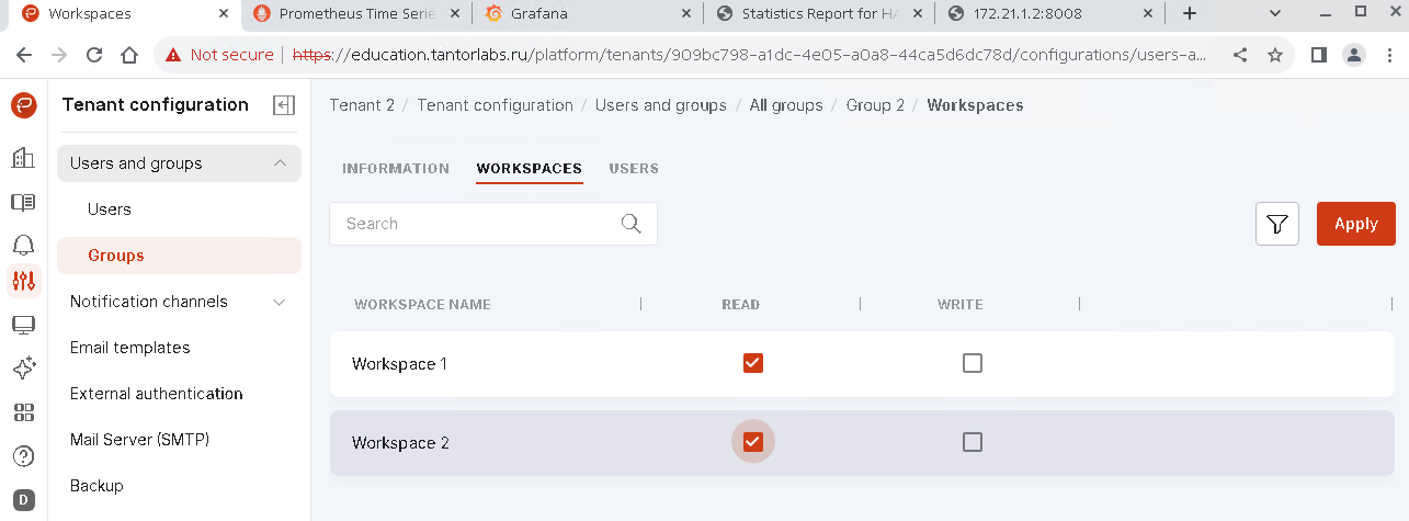 5) В поле Поиск по имени введите 2, страница обновится и останется только одно пространство Workspace 2. Уберите в поле Поиск по имени введенную цифру 2. Страница обновится, и покажутся три пространства.