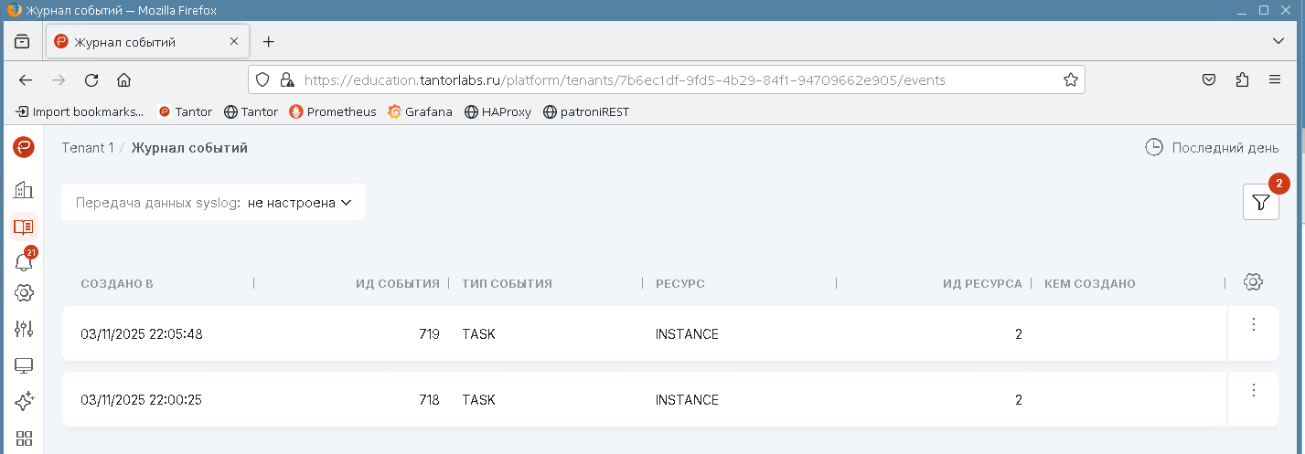 13) Откройте список экземпляров Tenant 1. Для этого перейдите на страницу тенанта Tenant 1 и кликните на вкладке ЭКЗЕМПЛЯРЫ: