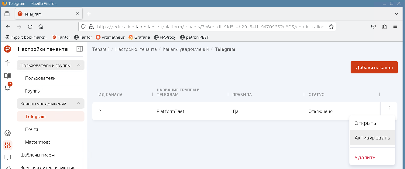 7) Откроется страница со списком тенантов. В Платформе будет тенант с названием Tenant 1.